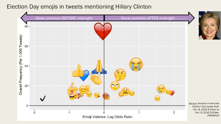 We can also compare emojis from earlier in the day to those used in the evening to understand the before and after journey for supporters of both candidates. Here, we plot these comparisons, for Hillary (left) and Trump (right), where in each plot, emojis closer to the right are more common after midnight. Thus, for Hillary, we see her supporters’ emotional journey from hope and conviction throughout the day to heartbreak and lament in the evening. The journey for Trump’s emojis seems less informative, although we do note how this particular contrast again elicits a mix of negative and positive emojis on the right.