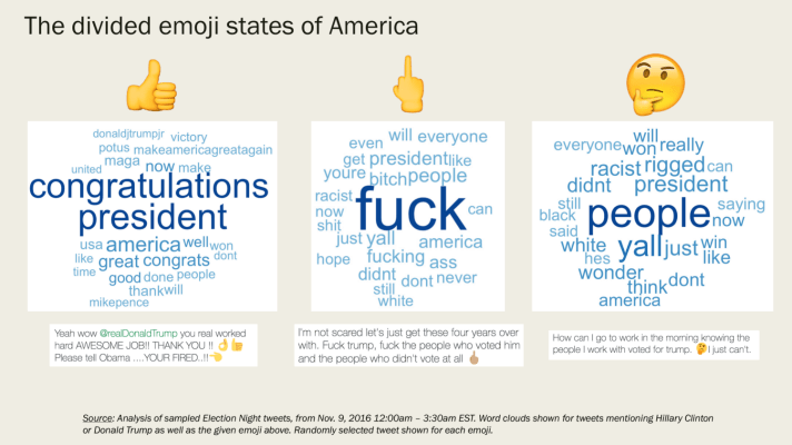 Americans are deeply divided politically and the emojis we used to respond to the election results reflect that. Here, we look at word clouds for three selected emojis — the 👍, the 🖕, and the 🤔 — in tweets after midnight.