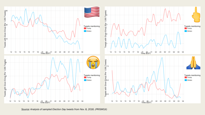 By plotting time series of the frequency of tweets with specific emojis — separately for Trump and Clinton — we can also isolate more granular reactions as news of the results came in.