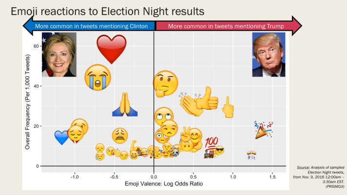 We plot the most commonly used emojis in tweets mentioning either Hillary Clinton or Donald Trump, looking specifically at tweets from after midnight Eastern Time on November 9, 2016. By this time, early results were indicating a Trump victory. (The networks finally called the election just before 3am, which is when Trump made his victory speech.)